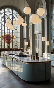 - Ánh sáng layered: đèn LED dưới tủ + đèn hắt trần + đèn treo nghệ thuật.