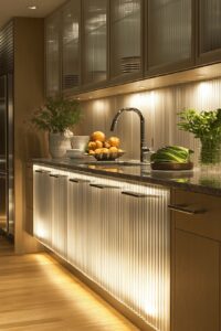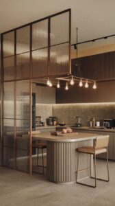 - Tủ kính viền kim loại mỏng (fluted glass) thay tủ gỗ kín.