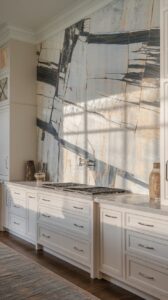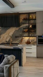 - Backsplash full height (ốp đá/tường gạch bông lên tận trần).